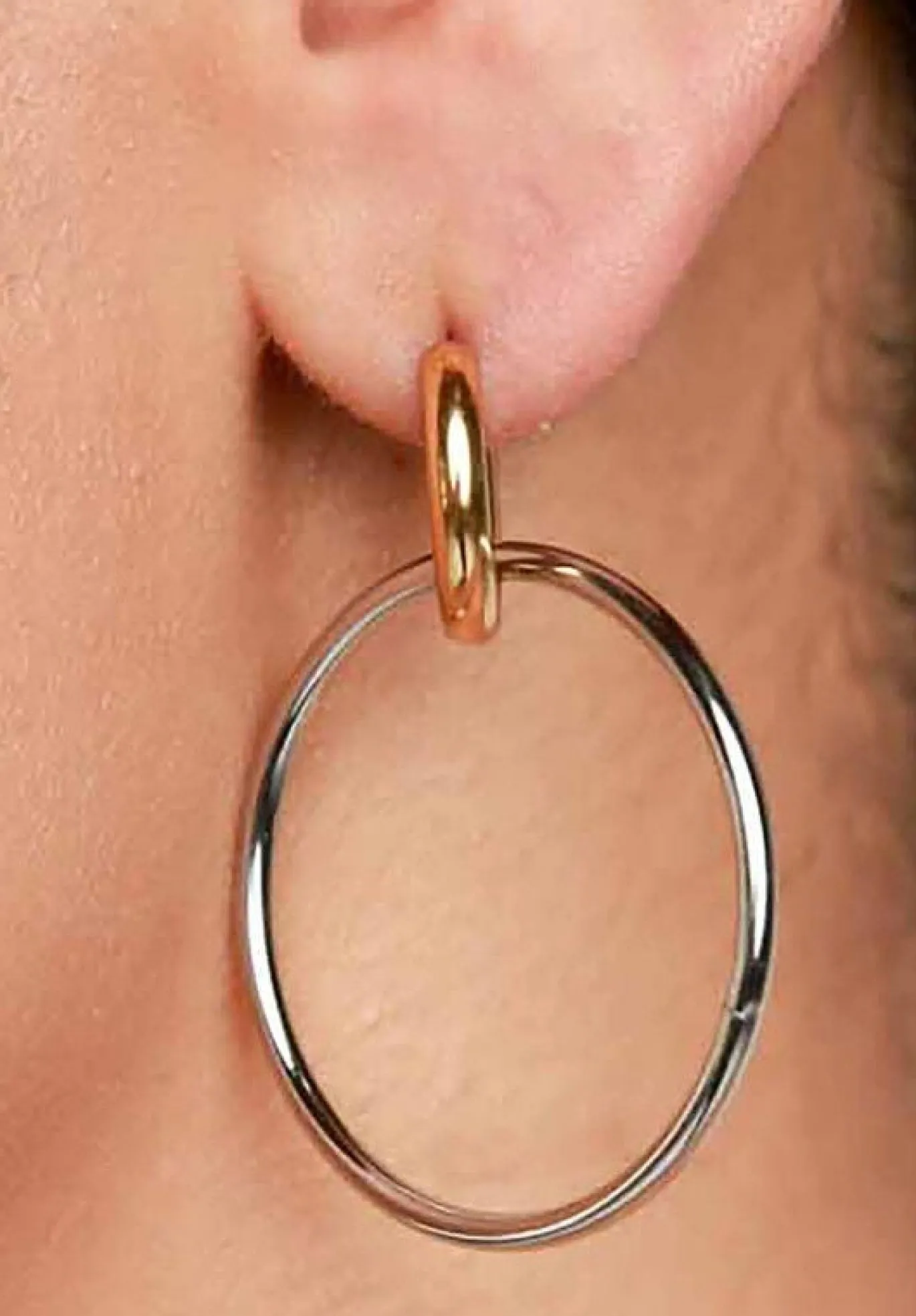 Two-tone drop hoops with a sleek, modern silhouette. Lightweight and effortlessly stylish.