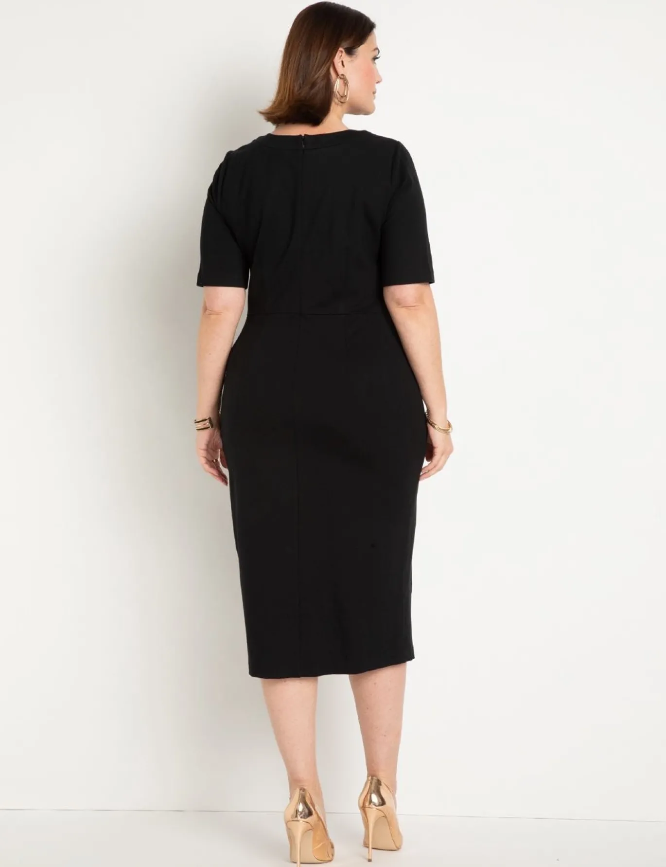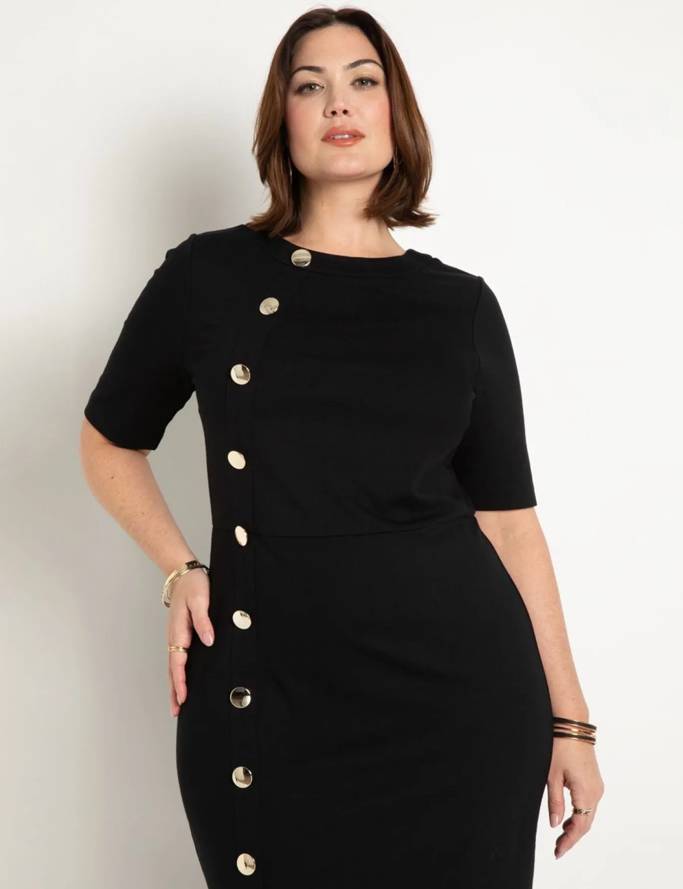 Marked by its off-center, hem-to-hem button details, this workwear dress brings tailored precision to power dressing. Its bodycon silhouette sleekly sculpts, while a modest neckline keeps it office-coded. It’s the ultimate desk-to-dinner staple.