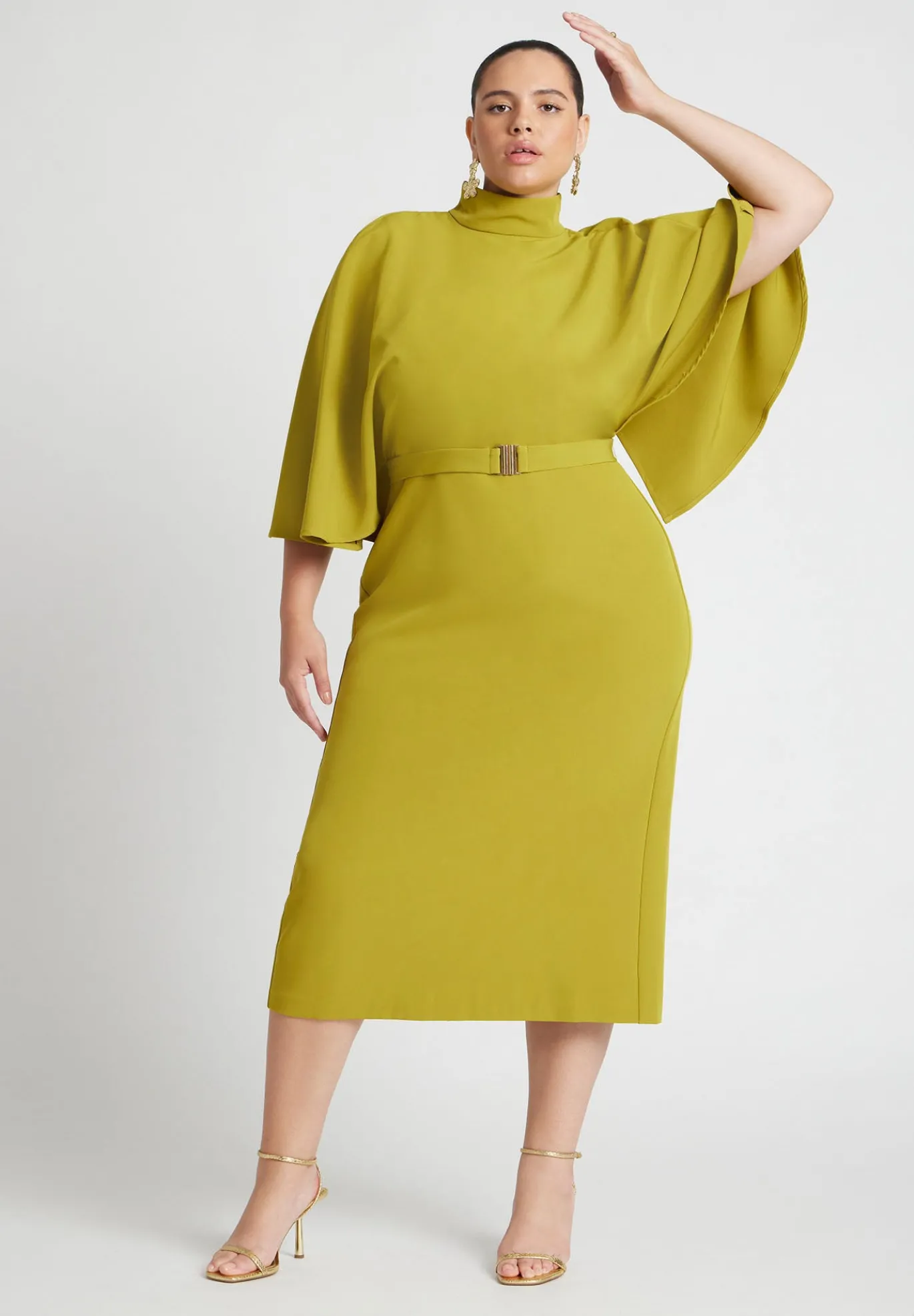 Designed for making entrances, this midi dress features a mock neckline, dramatic cape sleeves, & a removable belt that cinches the waist with tailored precision. It’s intentionally cut from a stretch-woven crepe to comfortably accentuate every curve.