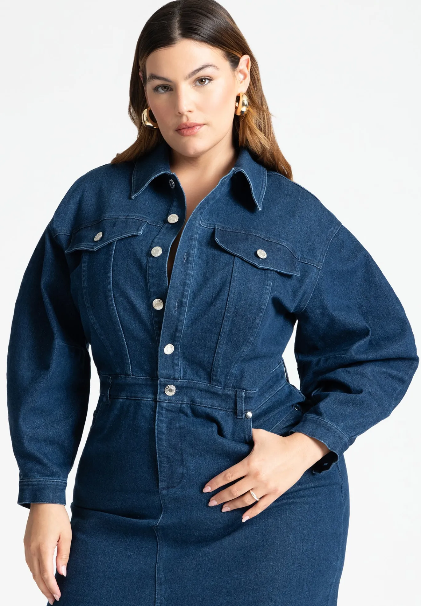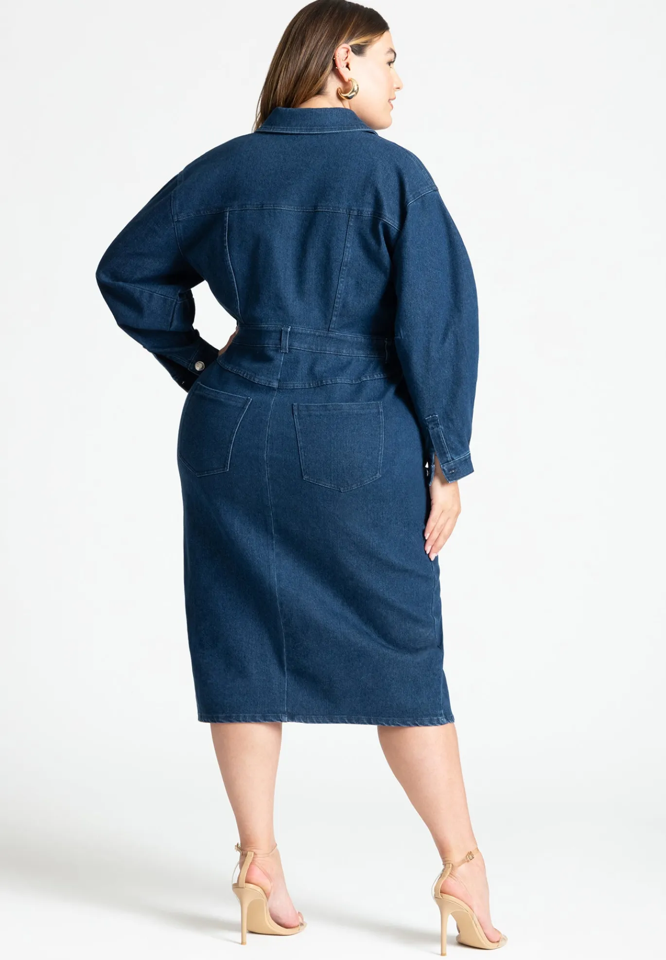 From its cinched-in waistline to relaxed, drop-shoulder bodice, this utilitarian-inspired denim midi dress balances structure and softness. It’s cut from stretch-denim for optimal comfort. Much like your favorite pair of jeans, it’s the perfect slot into your everyday rotation.