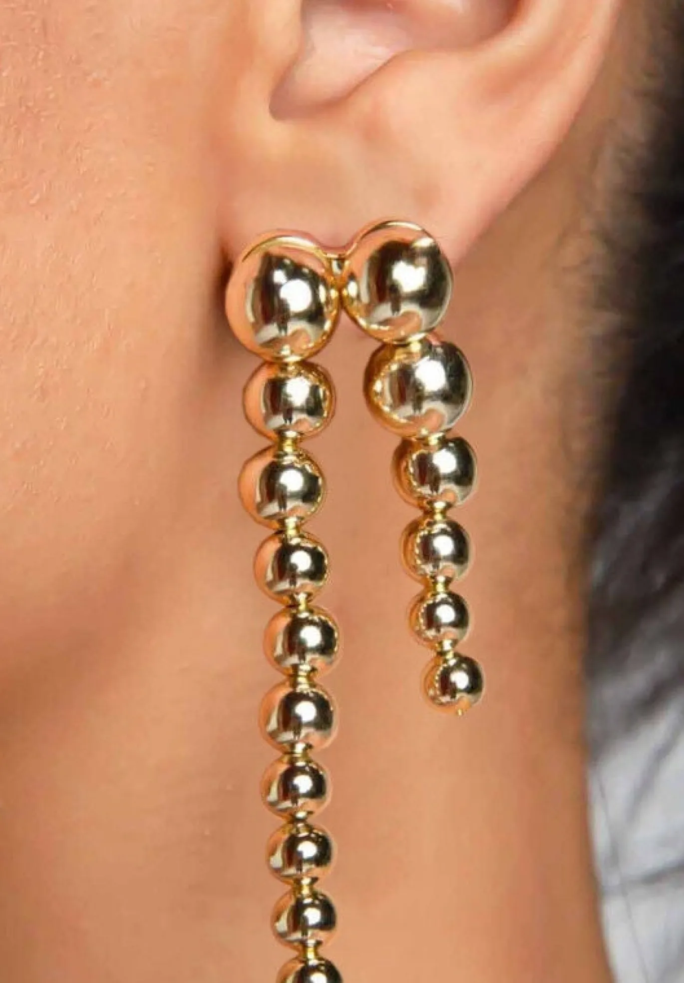 Sleek, sculptural drop earrings with cascading metal spheres. Modern, bold, and effortlessly chic.