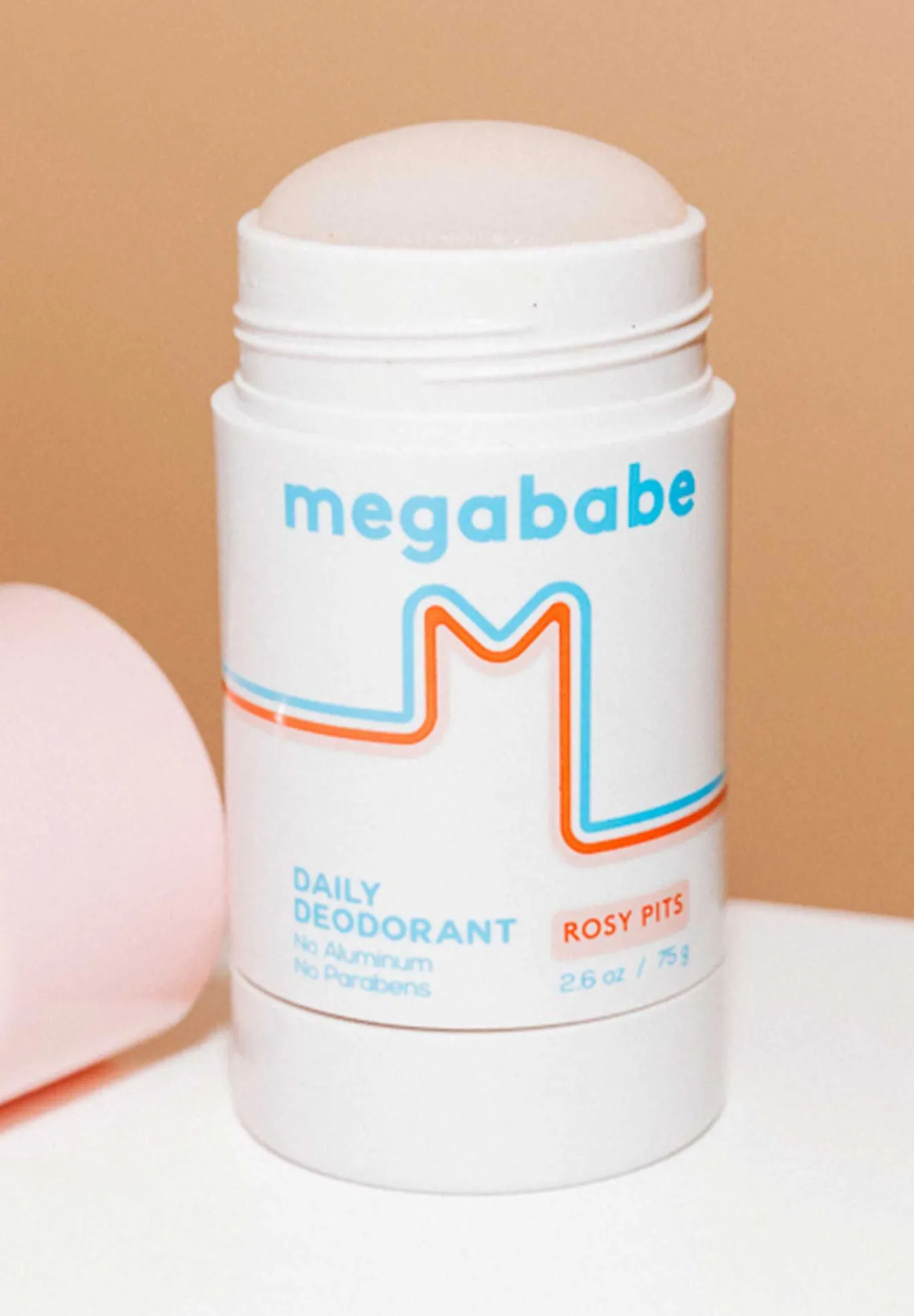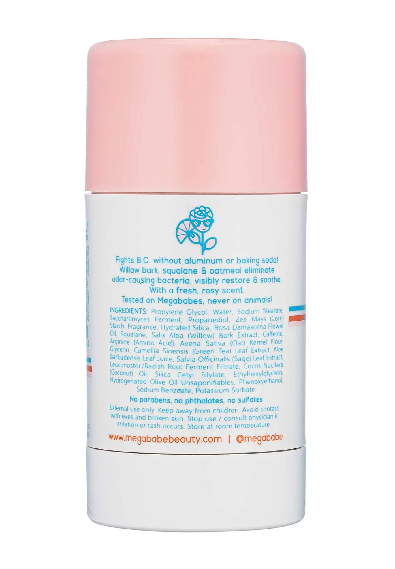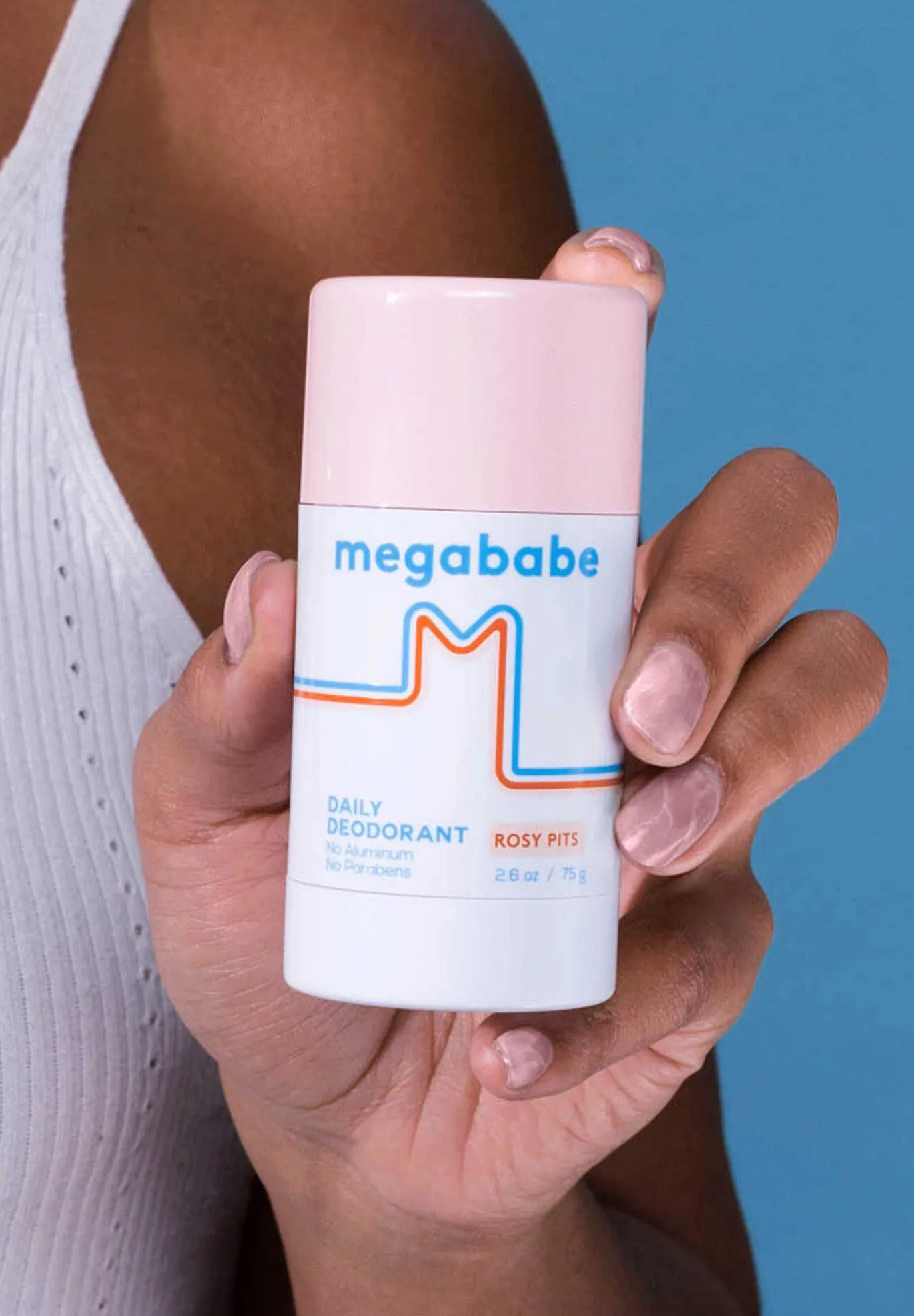 Megababe Rosy Pits Daily Deodorant is an aluminum-free, baking soda-free deodorant that glides on clear and leaves pits fresh and smelling like roses!