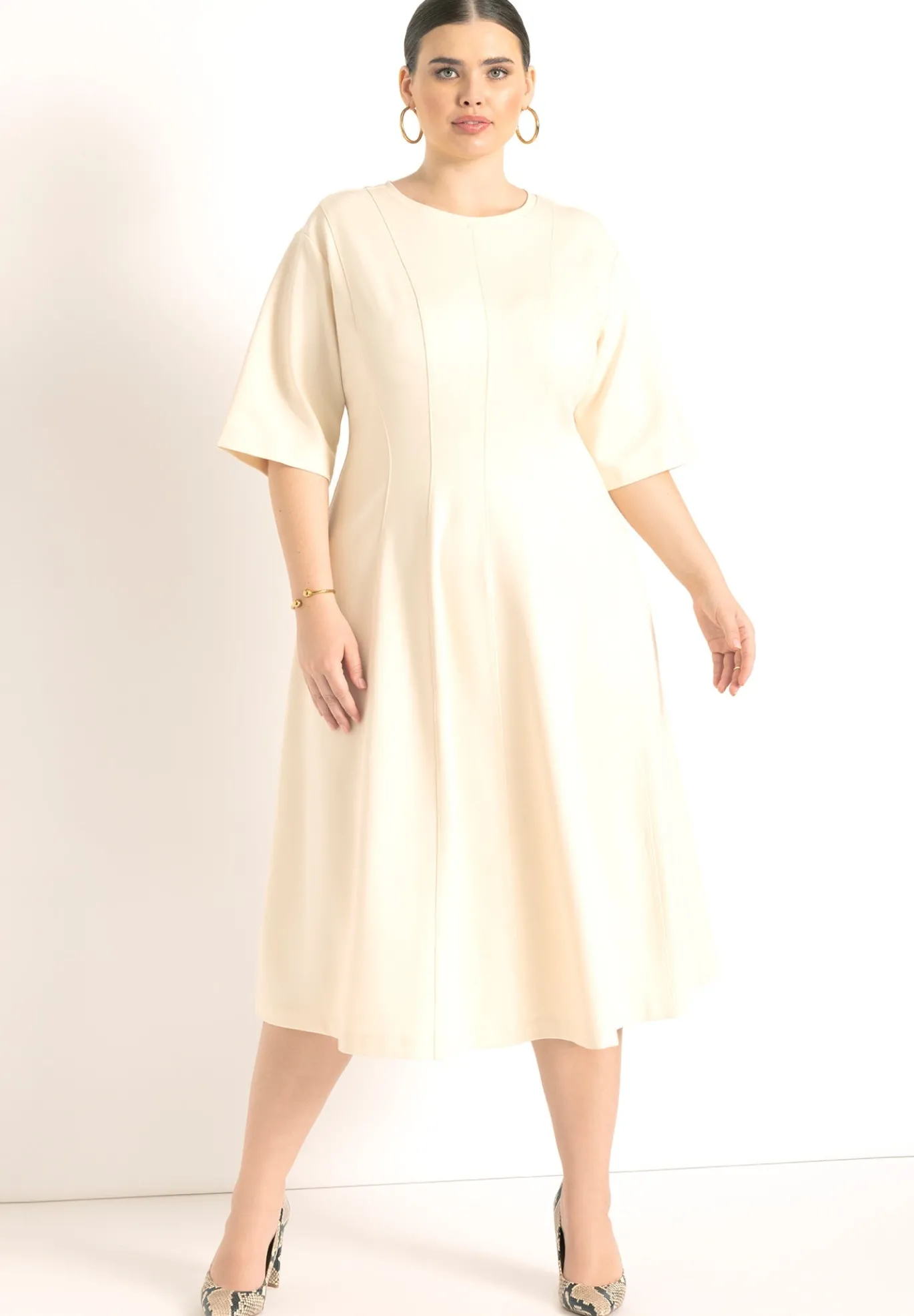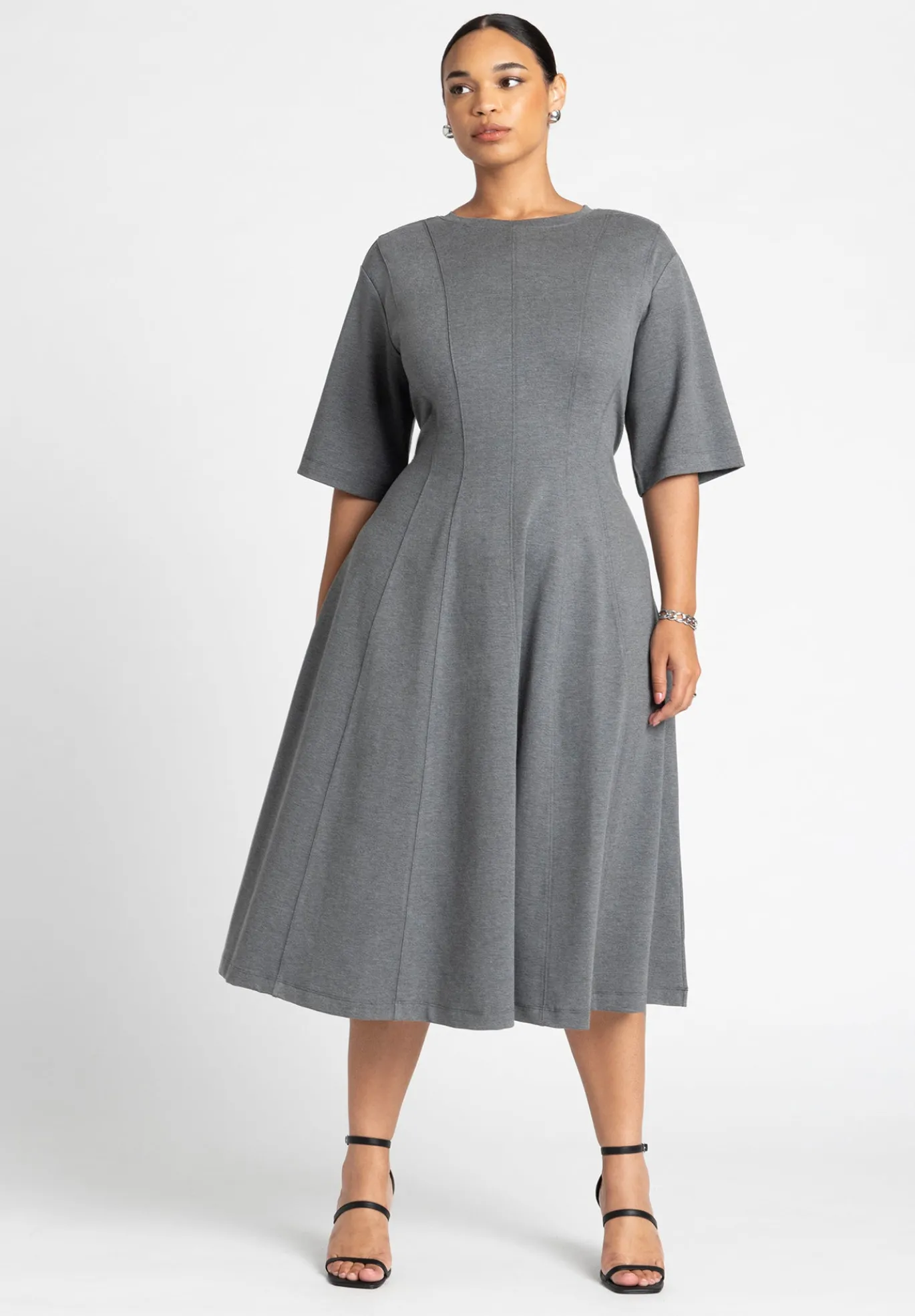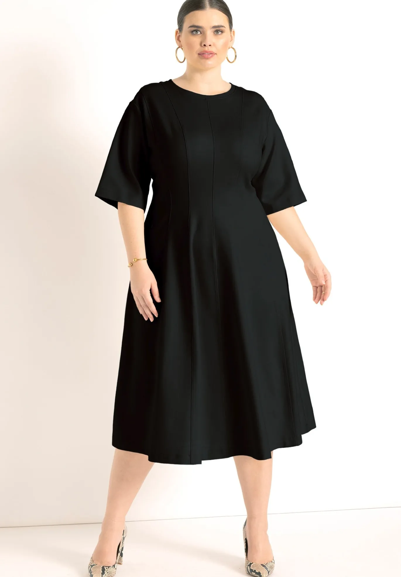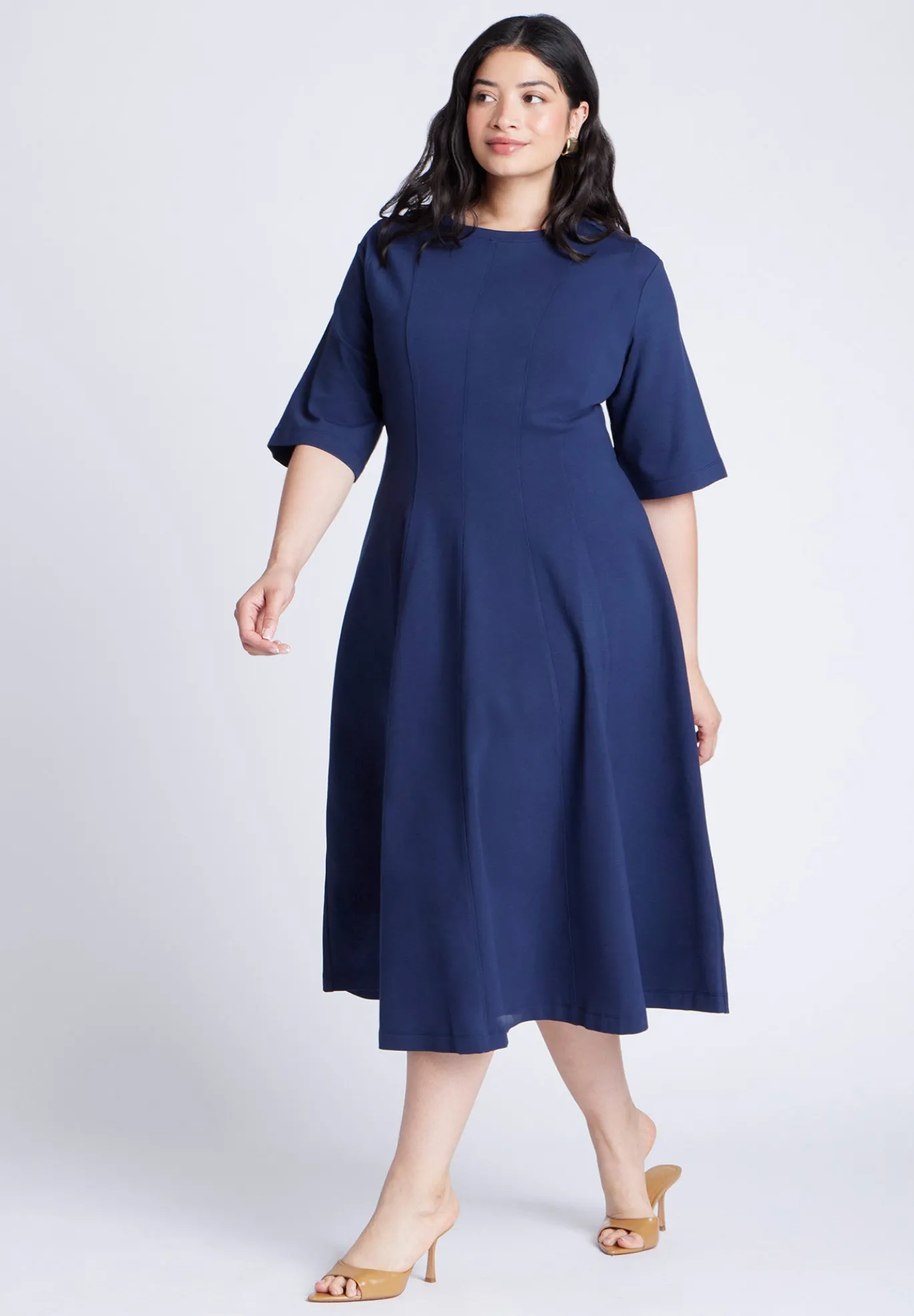 File under: desk-to-dinner essentials. Cut from a stretch compact knit, this sculpting midi dress features sleek princess seams & a nipped-in waist that frames to perfection. Style yours from morning meetings to happy hour.
